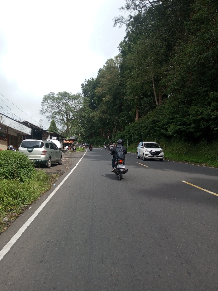 This image captures a street scene in Saing Ta Mawt Lay, Myanmar, under an overcast sky. A paved asphalt road, marked by a solid white line on its left edge and a broken yellow center line further down, extends from the foreground into the distance. A person wearing a black helmet and backpack is operating a dark-colored motorcycle, traveling away from the camera in the left lane. The motorcycle's license plate begins "B 3747". To the left of the road, a silver-grey compact SUV is parked on a dirt shoulder, partially obscured by green vegetation. Behind the SUV, a row of single-story buildings, one partially displaying "MINI MAR", line the street with additional motorcycles parked in front and a few individuals visible. To the right of the road, a steep hillside densely covered with tall, dark green trees and thick undergrowth forms a natural barrier. A white van is observed driving towards the viewer in the right lane, positioned further down the road from the motorcycle.