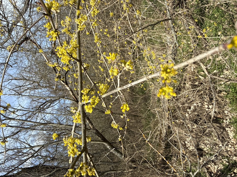 An outdoor scene in Sokolovo, Bulgaria, depicting a wooded area under clear daylight. The foreground is occupied by multiple branches of a plant, likely a Cornelian cherry (Cornus mas), densely covered with clusters of small, bright yellow flowers and buds. These branches are largely leafless. The midground consists of a dense tangle of dry, brown, leafless branches, fallen deciduous leaves, and patches of sparse green ground vegetation. In the background, numerous bare deciduous trees with intricate branch structures are visible, silhouetted against a bright blue sky with minor cloud formations. No individuals, animals, or artificial structures are present. The environment is characteristic of a natural forest or woodland during early spring.