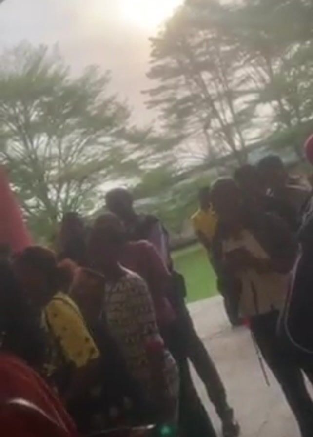 group of people gathered outdoors on a sunny day. There appear to be mostly young adults or teenagers, some wearing casual clothing. The environment suggests a school or educational institution due to the presence of what seems like a building and trees in the background. Many individuals are facing away from the camera or are partially obscured by others, making specific interactions difficult to discern. The general activity suggests a gathering or assembly.