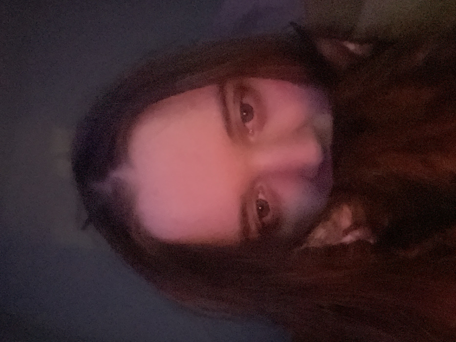 The image displays a close-up, low-resolution portrait of an individual, likely captured indoors under artificial lighting. The specific location within Pushchino, Russia, is not discernible from the visual information provided. The upper portion of the subject's face, including the forehead and eyes, is visible. The individual has long, dark hair with a central part. A reddish-pink light source illuminates the forehead and upper cheeks. The eyes are open and directed towards the viewer. The lower half of the subject's face, specifically the nose and mouth area, is obscured by a dark, furry object. This object is consistent with the head of a small animal, such as a cat or a small dog, positioned directly in front of the person's lower face. Faint outlines resembling animal ears are discernable on either side of the dark, furry mass. The background is dark, indistinct, and out of focus, suggesting an interior setting with low ambient illumination and no identifiable environmental features.
