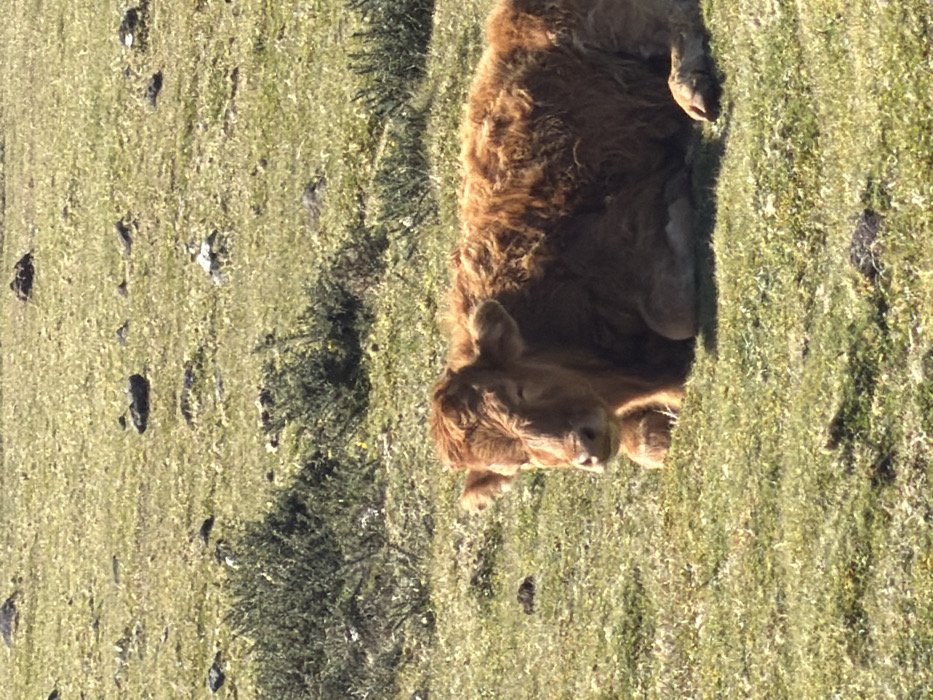 - "A light brown, shaggy-haired bovine is observed resting in a prone position on a sunlit green grassy field in the city of Porto Moniz, Portugal" by FM-JxfQU2, licensed under CC BY 4.0