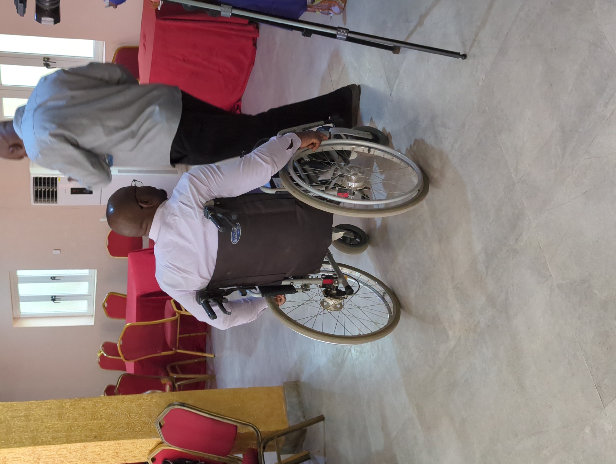 The image depicts the interior of a room in Unguwar Rimi, Nigeria, with tiled flooring and light-colored walls. Several red chairs are arranged around red-covered tables, suggesting a dining or event space. A man in a white shirt and glasses is seated in a dark-colored wheelchair. He is propelling the wheelchair forward by turning the wheels with his hands. Another person, wearing a light grey shirt and dark pants, is walking alongside the wheelchair. The lighting appears bright, possibly natural light coming through windows. There's a white air conditioning unit on the wall. A silver camera tripod is also visible.