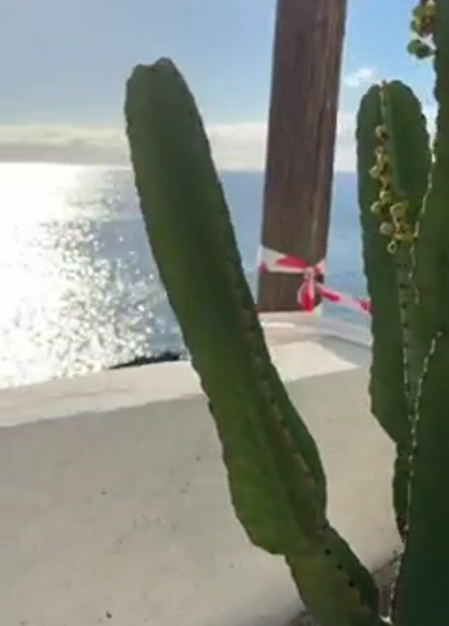cactus in a pot in front of a blue ocean. The cactus is green with some red spots, and has many small flowers. The ocean is glistening in the sun, and there are some rocky outcroppings in the water. The sky is blue with some clouds. There is a white wall between the cactus and the ocean. There is a wooden post wrapped in caution tape.