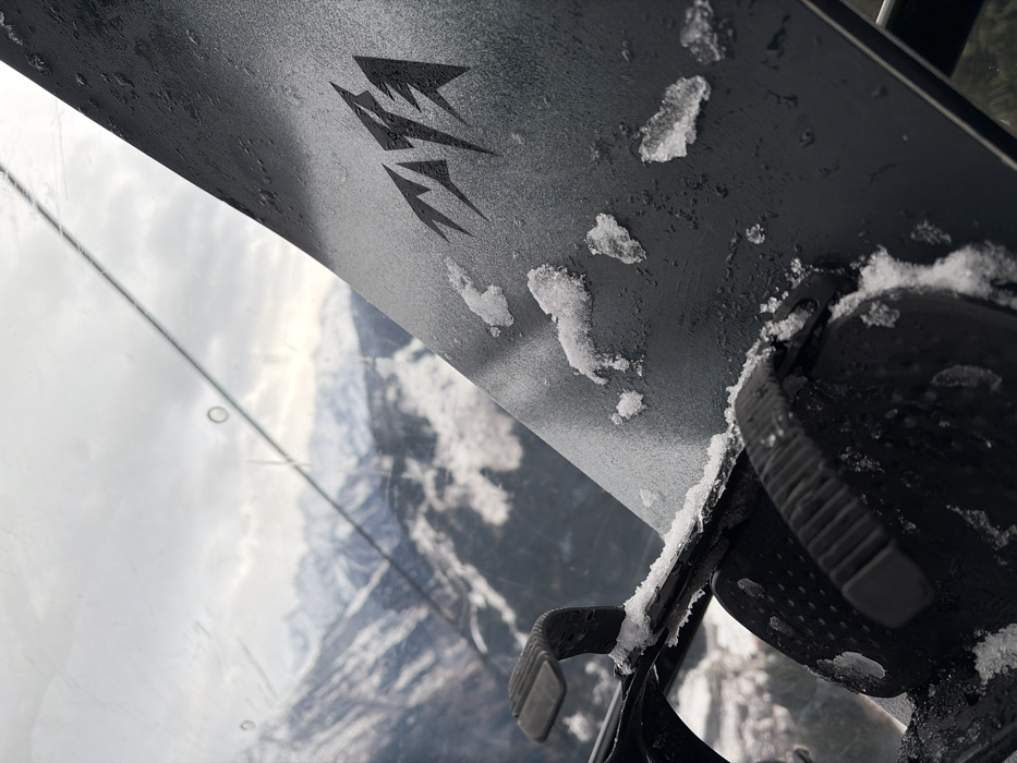 - "A partial view of a snowboard featuring the "Jones" logo sits within a gondola or chairlift, offering a snowy mountain vista through the window" by FM-OzlZ32, licensed under CC BY 4.0