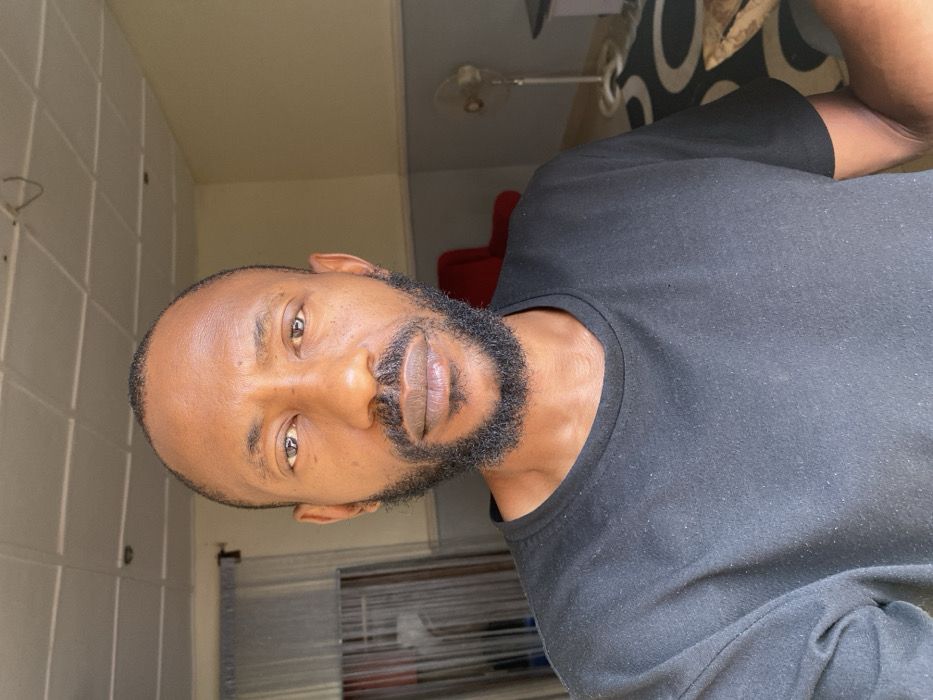 The image depicts an indoor scene in Sabon Tasha, Nigeria. A male individual with dark skin, a closely shaved head, and a full dark beard and mustache is positioned in the foreground, looking directly at the camera with a neutral expression. He is wearing a plain dark, likely black, short-sleeved t-shirt. The background on the left features a window covered by light-colored vertical blinds or curtains, allowing natural light to illuminate the scene. The background on the right shows a wall painted cream on the upper section and grey on the lower section. A red upholstered armchair is partially visible in the mid-ground. Further right, a silver-colored standing fan with white blades is positioned on a patterned rug, which is dark with white circular designs. A dark, possibly black, side table is partially visible on the far right. The ceiling is white with a grid-like pattern, and a loose wire or hook hangs from it.