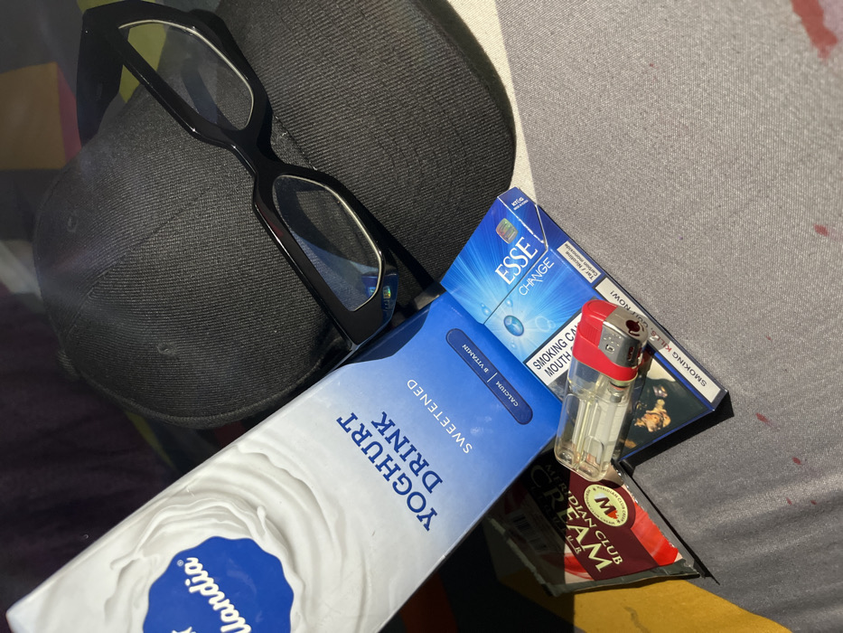 The image displays a collection of items placed on a textured grey fabric surface. Dominating the upper left is a white and blue carton labeled "Hollandia YOGHURT DRINK SWEETENED." To the right of the carton, a black baseball cap is positioned with its brim facing away from the viewer. Resting horizontally across the cap is a pair of black-framed eyeglasses with clear lenses. Below the yoghurt carton, a blue pack of "ESSE CHANGE" cigarettes is visible, partially obscured by the carton. A clear plastic lighter with a red top is placed on top of this cigarette pack, and beneath the lighter, another cigarette pack with a dark graphic featuring a person's face is partially exposed. To the far left, a red and white wrapper or pouch labeled "CREAM MERIDIAN CLUB" is partially visible. The grey fabric surface shows small, reddish-brown stains in the lower-left area. A patch of yellow fabric is also visible on the far left edge of the frame. The background is dark and indistinct. No individuals are present in the scene, and no specific actions or interactions are depicted. The location in the city of Lokoja, Nigeria, cannot be determined from the visual information provided.