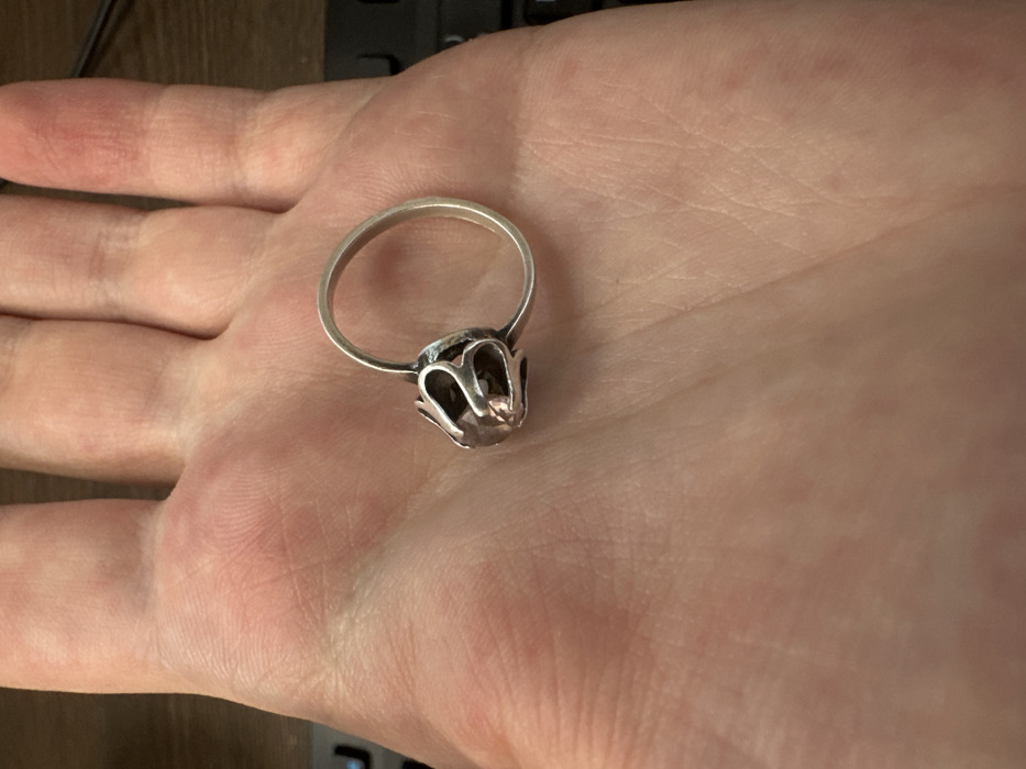 A hand holds a silver ring featuring a pale pink gemstone. The ring's setting appears detailed, with a crown-like structure cradling the stone. The band is simple and thin. The hand is fair-skinned, with visible lines and textures. A dark keyboard and a wooden surface are in the background. The image is well-lit, highlighting the ring's details and the texture of the hand.