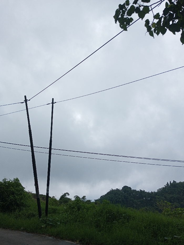 The scene depicts an outdoor environment in Ambakirano, Madagascar, under an overcast sky. Two dark utility poles stand vertically in the left-center, supporting multiple taut black wires that extend horizontally across the frame at varying heights. A narrow strip of dark gray pavement, indicative of a road, is visible along the bottom left. The lower half of the image is dominated by lush, green, overgrown grasses and shrubs. In the background, to the right, densely forested hills rise under the muted light of the cloudy sky. A cluster of dark green leaves from a tree branch is partially visible in the upper right corner. No individuals or discernible actions are present.