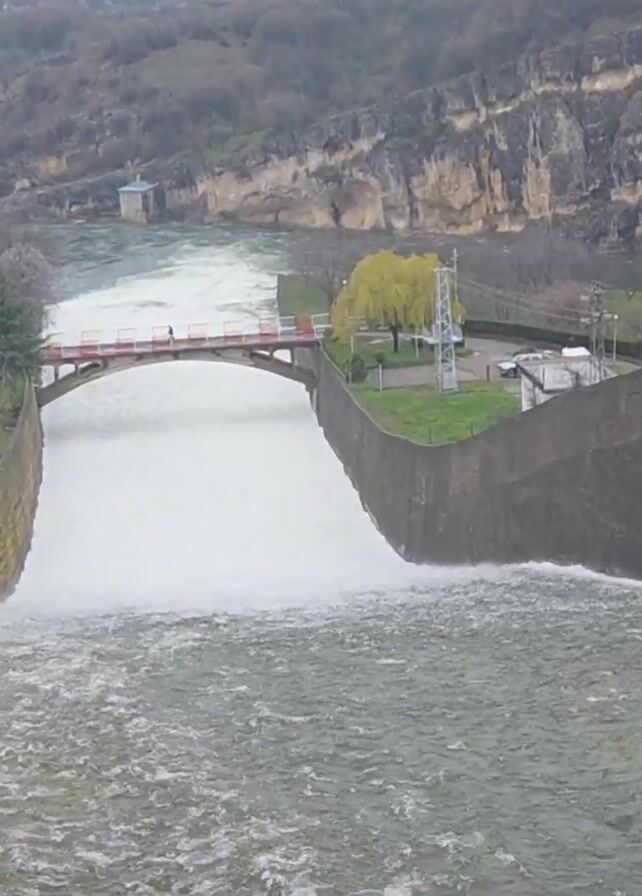 dam overflowing with water. The dam walls are visible on either side, and a bridge spans the top of the spillway, with a person walking across it. The water is rushing over the dam in a powerful cascade. The environment appears to be somewhat rural, with hills and trees visible in the background. The day seems overcast and cloudy.