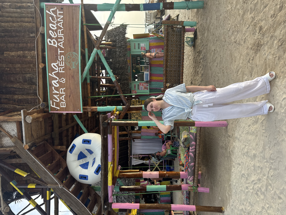The image displays Furaha Beach Bar & Restaurant in Kendwa, Tanzania, situated on a sandy beach under natural daylight. In the foreground, a young adult female stands, angled slightly to her right, with her left hand raised to her temple. She wears a light blue and white striped short-sleeved button-up shirt tied at the waist, white wide-leg trousers with front tassel ties, and white slide sandals. Her dark hair is pulled back, secured by a light-colored scrunchie. Behind the woman, the multi-level wooden structure of the Furaha Beach establishment is visible. Its support beams and pillars are painted in alternating stripes of pink, green, yellow, and blue. A prominent wooden sign above the lower level reads "Furaha Beach BAR & RESTAURANT" in white lettering with a turquoise wave motif. On a wooden platform above the main level, a large, white and blue circular inflatable tube is positioned. To the left within the structure's shaded area, a wooden swing bed with patterned cushions is present. Beyond this, several individuals are seated at tables or in lounge areas. To the right, a smaller, distinct bar counter, constructed with brightly colored horizontal panels and topped with a thatched roof, is visible. A person wearing a light-colored bikini top stands at this counter, facing away from the camera, while another individual is partially obscured behind the counter. The ground is composed of light brown sand. In the distant background, to the right, several boats are visible on the water under a light sky.