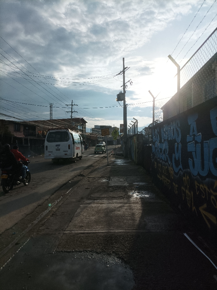 The image depicts an urban street scene in Popayán, Colombia, under a partly cloudy sky with prominent sunlight from the right. The view is from a low angle, looking down a street. In the immediate foreground, a darkened concrete sidewalk with several visible puddles extends from the lower left to the upper right. To the right of the sidewalk is a high, dark wall heavily covered in multi-colored graffiti, predominantly blue and yellow text. Above this wall, a chain-link fence topped with barbed wire is sharply silhouetted against the bright sky. To the left of the sidewalk, an asphalt road appears partially wet. A black motorcycle is positioned on the left side of the road, facing away from the viewer. Two individuals are on the motorcycle: the driver wears a dark helmet and dark jacket, and the passenger wears a red jacket. Further down the road, a white passenger van, possibly a minibus, with red markings, is traveling away from the camera. Beyond the van, a light green vehicle is also visible heading in the same direction. A white pedestrian crossing (zebra crossing) is marked on the road surface. Multiple utility poles with numerous overhead power lines crisscross the upper left and central portions of the frame. One prominent utility pole with a transformer is situated on the right side of the road, close to the fence. Buildings, appearing to be multi-story residential or commercial structures, line the left side of the street. The background shows additional buildings and distant terrain under the cloudy sky, which is brightest on the right side where the sun is breaking through, causing a slight lens flare. The overall lighting suggests a backlit scene, creating strong contrasts and shadows on the left and in the foreground.