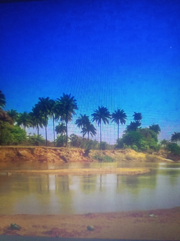 This image depicts a natural landscape located in Akwanga, Nigeria, under a bright blue sky. The upper half of the frame is filled with a clear, deep blue sky, exhibiting prominent vertical scan lines. Below this, a wide, calm body of water, appearing greenish-brown, occupies the lower-mid ground and reflects the sky and distant vegetation. The immediate foreground shows a level, light brown earthen bank with minimal scattered debris. On the opposite side of the water, an elevated riverbank is visible, characterized by exposed, reddish-brown eroded earth. This bank is densely vegetated, primarily with numerous tall palm trees displaying dark green fronds, interspersed with other green foliage and bushes. No human figures, animals, or man-made structures are discernible within the scene.