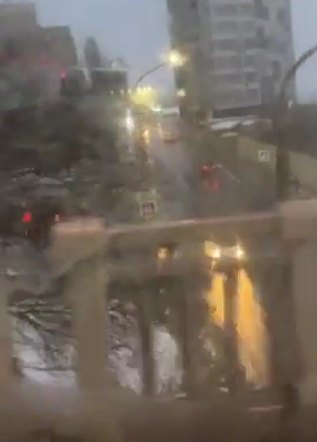 view from a bridge or elevated structure overlooking a city street during inclement weather. The weather appears to be rainy or snowy, with a gray sky and wet surfaces. The road below has vehicles moving along it, indicated by headlight and taillight reflections. There are buildings in the background, including a tall building with a patterned facade. The camera moves slightly, panning across the scene. The perspective is slightly obscured by elements of the bridge or structure from which the video is being recorded. The lighting is dim due to the weather and time of day.