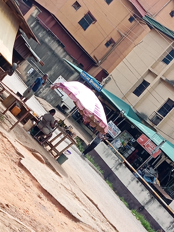 This image depicts a diagonal view of an urban street scene in Onitsha, Nigeria, during daylight hours. In the immediate foreground, the ground consists of a rough, reddish-brown dirt path exhibiting cracks and unevenness. This transitions to a lighter-colored, paved or concrete surface. A low concrete curb, with sparse green vegetation and a horizontal metal bar, separates these ground textures. Three individuals are visible in the midground. To the left, a female, dressed in light-colored clothing, is seated on a low stool behind a simple wooden stall, appearing to attend to items on its surface. A green bucket and a purple-lidded bucket are positioned near her stall. Slightly to her left, a male wearing a blue short-sleeved shirt and light-colored shorts stands near another wooden stall, with his back partially towards the viewer. To the right, a male in dark attire stands beneath a large, light pink and white striped umbrella, positioned adjacent to a commercial establishment. Commercial structures line the background. A building features a prominent green awning with "GOD'S CAR PHARMACY" inscribed in blue text. Below this, a white sign is partially visible, reading "ALL HALLOWS MEDICAL DIAGNOSIS LABORATORIES." Further to the right, a red sign displays "ANGELIC MARKET" with an additional Coca-Cola logo above it. Multi-story buildings, including a light brown structure with multiple dark windows and a darker reddish-brown building behind it, form the distant background. Overhead, numerous electrical or communication lines crisscross the sky.