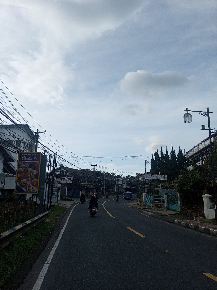 A road curves through a town under a cloudy sky. Several people on motorbikes travel along the asphalt road marked with yellow lines. Buildings and vegetation line both sides of the street, with a large advertisement on the left. Utility poles and wires crisscross overhead, adding to the urban landscape. A decorative street lamp stands on the right side of the road, further defining the scene.