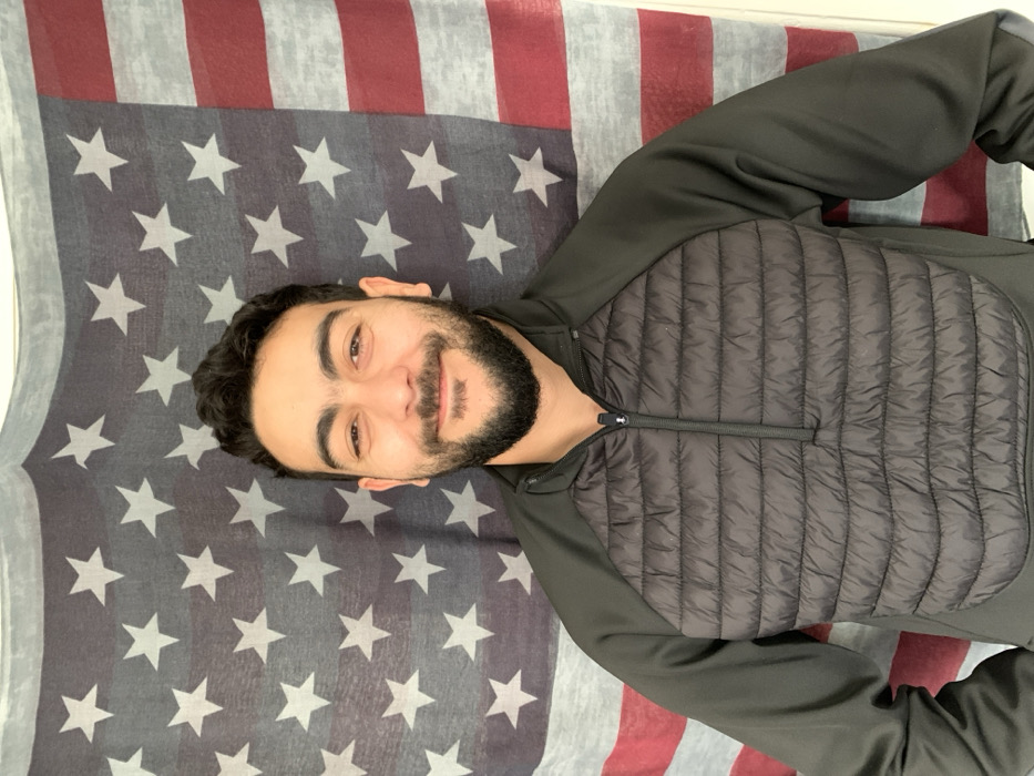 A frontal, waist-up portrait depicts an adult male against a draped United States flag. The male subject, appearing to be in his late 20s to early 40s, possesses dark, wavy hair, dark eyes, and a full, trimmed dark beard and mustache. He is smiling broadly, revealing his teeth, and looks directly towards the camera. He wears a dark, possibly black or dark gray, quarter-zip jacket featuring a quilted, padded section on the chest and smooth fabric on the sleeves and shoulders. The United States flag serving as a backdrop exhibits its red and white stripes and a field of white stars on a muted blue ground; the fabric appears somewhat faded and creased. The environment is indistinct beyond the flag backdrop, indicating an indoor setting. The image provides no discernible visual information to ascertain the location as Tangier, Morocco, or any other specific geographical area.