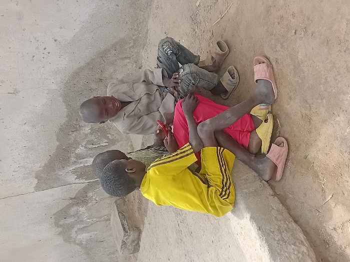 Three young males are depicted outdoors in Ayama, Nigeria. The individual on the left, wearing a yellow t-shirt and matching shorts with black stripes, sits on a concrete ledge with pink slide sandals on his feet. To his right, a second individual, dressed in a striped shirt and red trousers, sits on the dirt ground leaning against the ledge, holding a red smartphone with both hands and actively viewing its screen. His yellow slide sandals are visible near his feet. A third individual, wearing a light-colored long-sleeved shirt and dark ripped jeans, sits to the right of the second boy on the ground, with brown slide sandals on his feet. All three appear focused on the smartphone. The background consists of a weathered, light-colored concrete or mud wall with visible textures and a small concrete block. The ground is dry, light brown dirt.