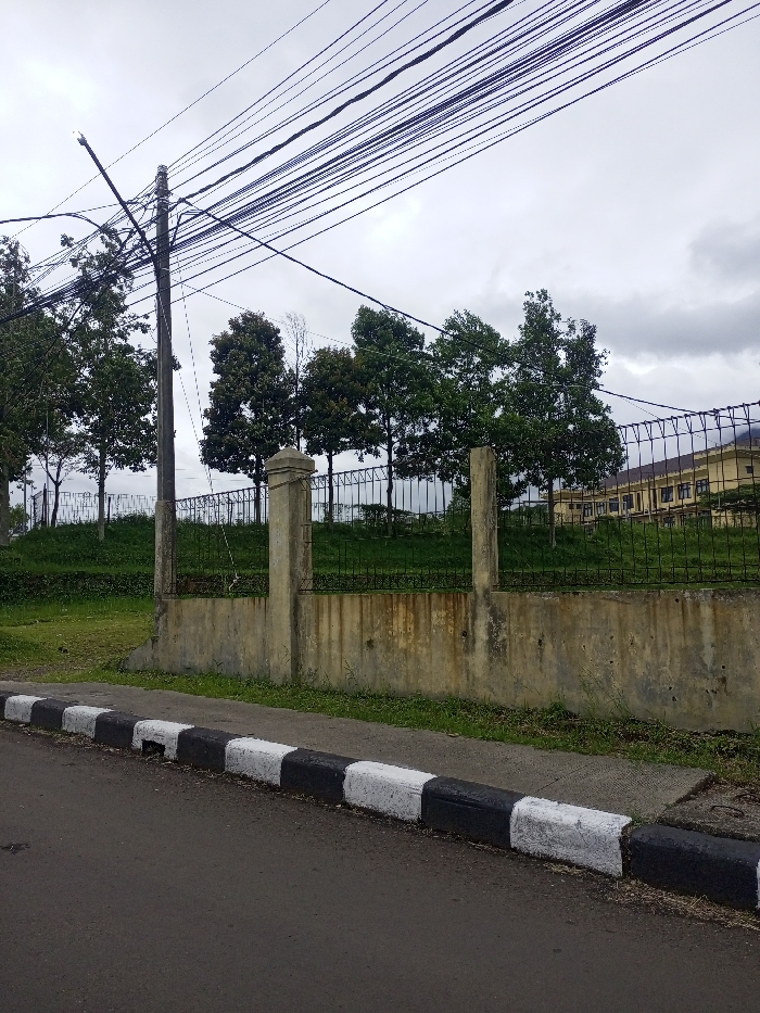 A street scene under a cloudy sky features a roadside curb painted with alternating black and white blocks. Behind it is a low, aged concrete wall with pillars supporting a dark metal fence. Trees line the background above the fence, partially obscuring a multi-story building. Overhead, a dense network of power lines stretches across the sky. The scene presents a mundane, overcast, and somewhat weathered urban environment.