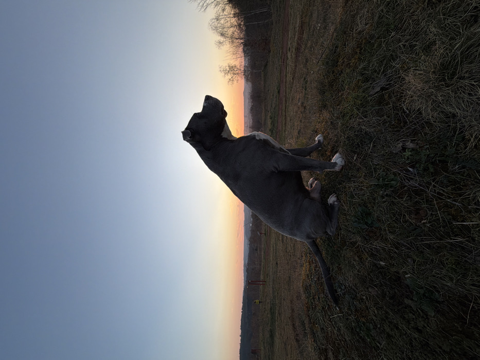 - "A stocky, short-haired grey dog, consistent with a Pitbull-type breed, with white markings on its chest and paws, sits in profile on a low, grassy mound" by FM-n22Rc2, licensed under CC BY 4.0