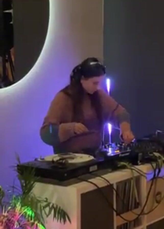 A woman DJ is seen at work in a dimly-lit room. The female DJ is wearing headphones, and a multicolor sweater. Behind her is a decorative, circular-shaped mirror, lit with blue LED lighting. There is a record player and mixing board set up in front of her, along with a tall, narrow set of lights. The record player and mixing board are set on top of a white shelf filled with records. A potted plant is seen to the left of the shelf, in the lower left corner of the frame.