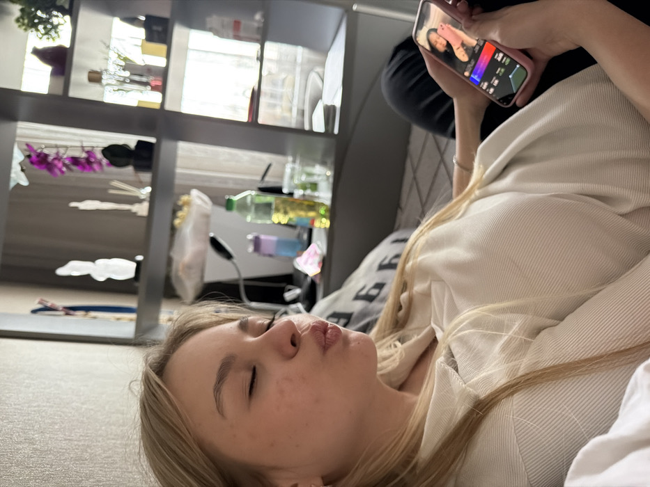 An indoor scene features a blonde female, estimated to be a young adult, reclining