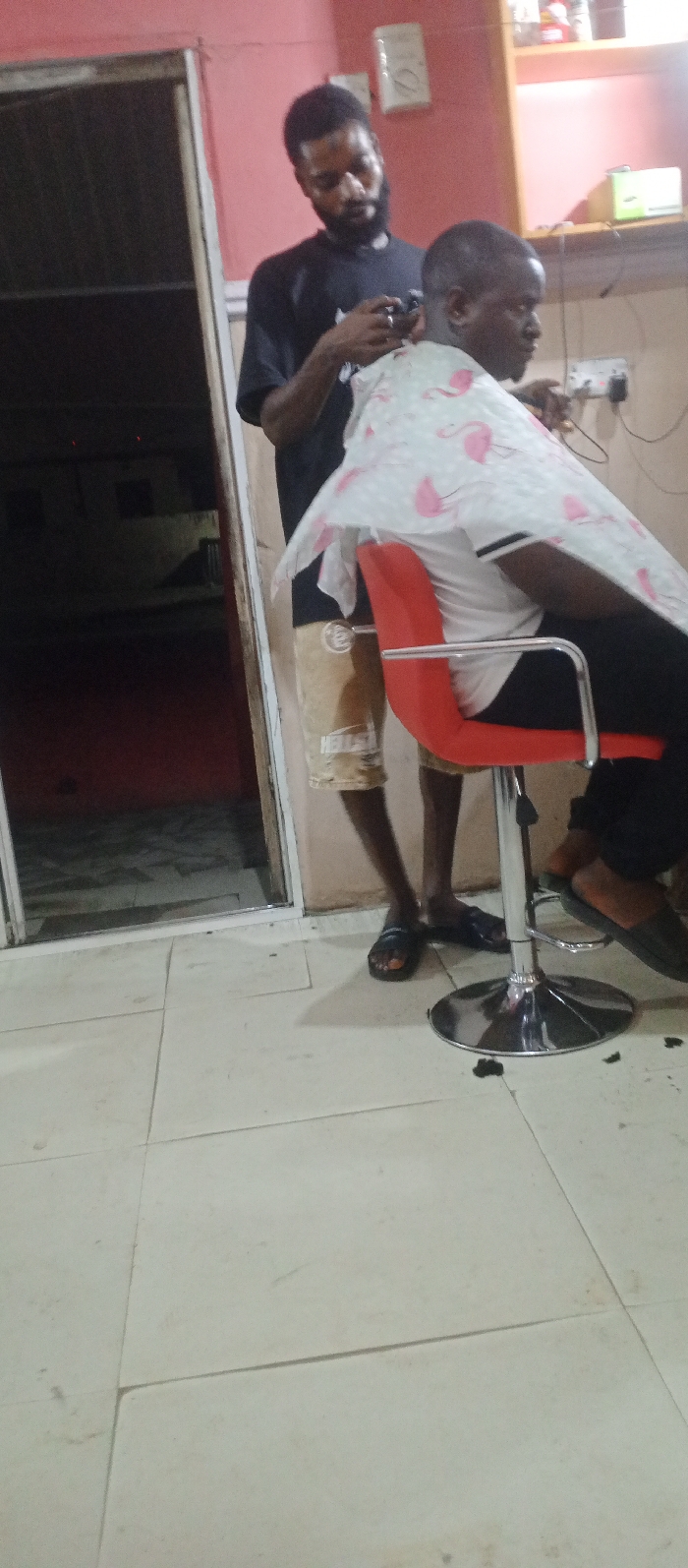 Inside a commercial establishment, identified as a barbershop, in the city of Unknown, Unknown, two adult males are present