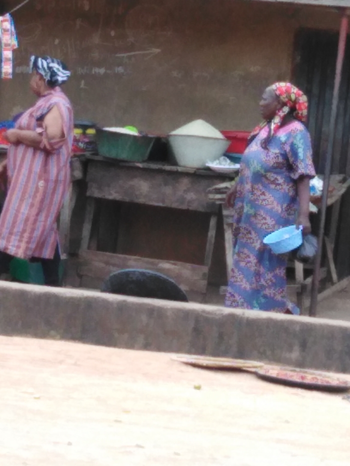 This image depicts a market scene in the city of Narayi, Nigeria. Two adult females are present, positioned in front of a rudimentary stall or shop structure. On the left, a woman stands facing right, wearing a light-colored striped dress with short sleeves and a patterned black and white headwrap. She is partially obscured by the foreground. Behind her, small packaged items are suspended from an unseen support. To the right, another woman stands facing left, wearing a long, loose-fitting, patterned blue and purple dress and a red floral headscarf. She holds a light blue plastic bowl in her left hand and a dark plastic bag in her right hand. Between and behind the women is a wooden stall or table with an open lower section. On the table, various items are visible: a large, light-colored conical mound, possibly a grain like rice or flour, contained within a large white basin; a green basin; and other smaller containers. The background wall is plain, earthy-toned, with indistinct white markings and an arrow drawn on its surface. In the mid-ground, a concrete barrier or ledge runs horizontally. Below this barrier, on the dirt ground, a dark, flat, circular object (possibly a pan or tray) rests directly beneath the wooden stall. In the bottom right foreground, two flat, possibly woven, circular trays are visible on the ground. The overall ground appears unpaved and dusty.