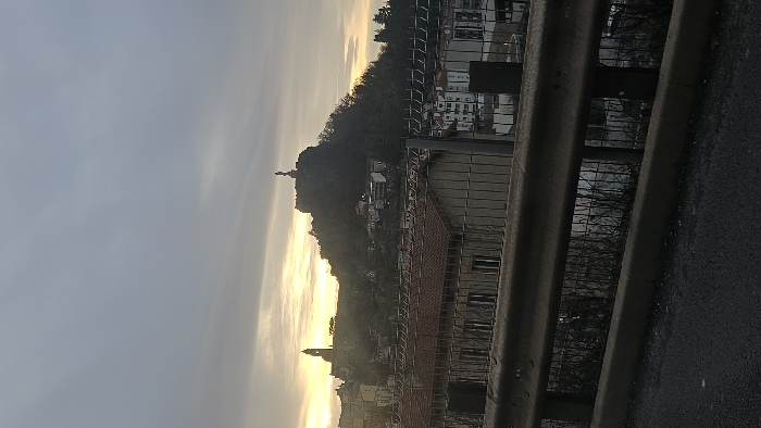 A distant statue atop a tree-covered hill is silhouetted against a bright, cloudy sky at sunset or sunrise. Buildings and structures dot the hillside leading to the foreground. A gray road and metal guardrail are visible in the foreground, suggesting the image was taken from a bridge or elevated roadway. The lighting is low, casting long shadows and obscuring detail in the foreground.