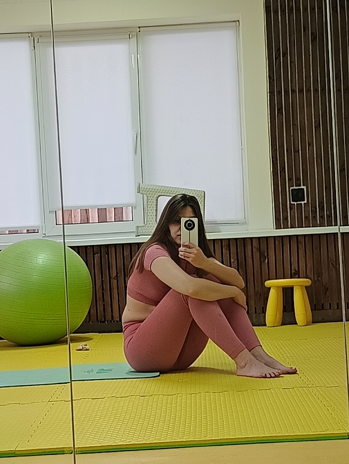A woman in a matching pink athletic outfit sits cross-legged on a yellow exercise mat, knees drawn towards her chest. She's holding a phone, likely taking a photo in a mirror. Behind her is a green exercise ball, a small yellow stool, and a window with white blinds. The background also features wood paneling with thin vertical lines and a white frame.