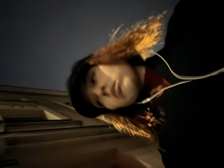 A low-angle shot features a person with reddish-blonde, somewhat frizzy hair, wearing a dark jacket with a white stripe. Part of a building is visible in the bottom left, suggesting the photo was taken outside at night. The background sky is dark, with soft light illuminating the person's face and hair. The person is wearing a black hat. The angle is slightly tilted, adding a dynamic feel to the composition.