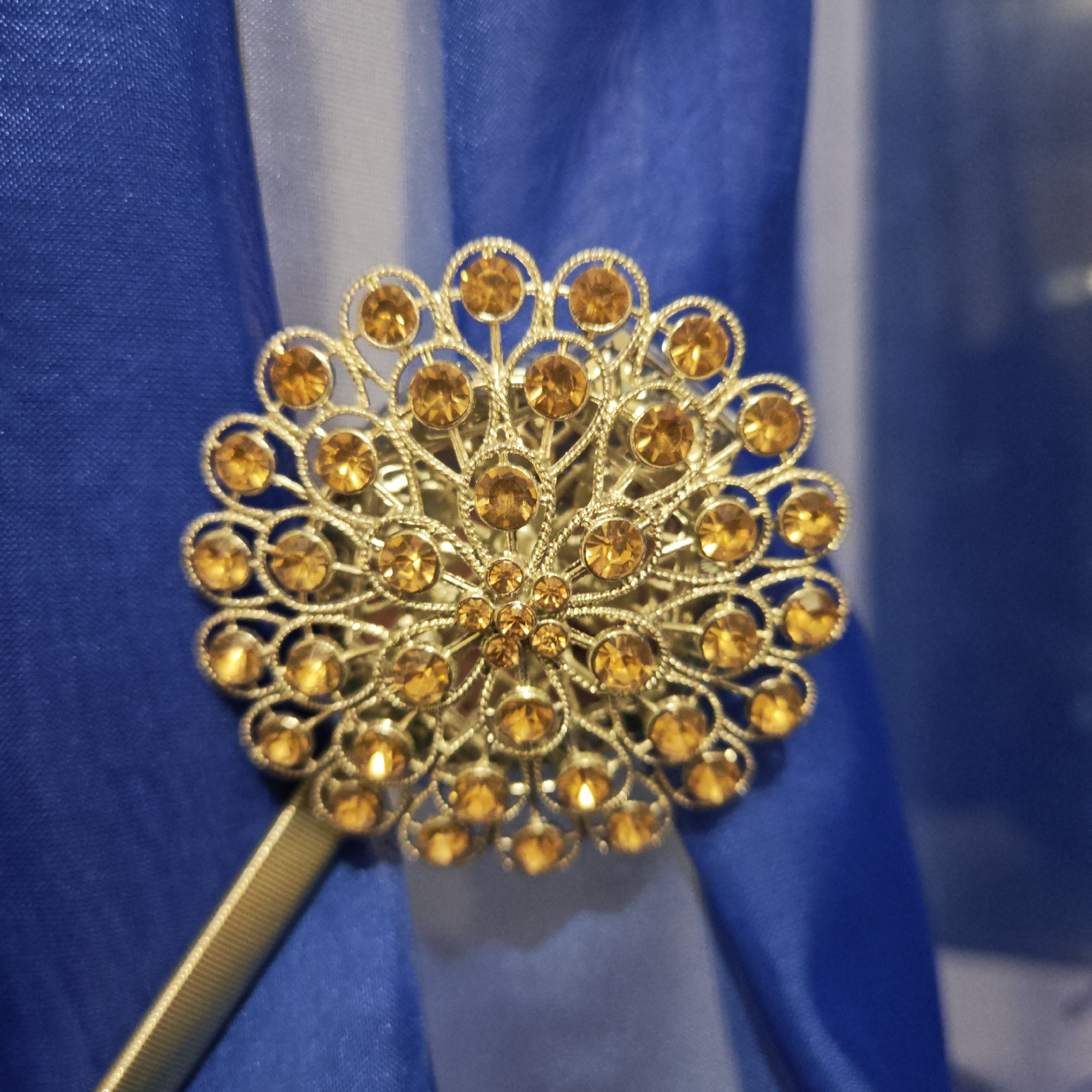 A close-up shot depicts a gold-toned, circular decorative item, possibly a curtain tie-back or brooch. It features a filigree design with embedded amber-colored gemstones. The ornament is positioned against a backdrop of draped fabric in shades of blue and white. The environment appears to be indoors. No people or interactions are visible in the image. There is no indication of the location in the city of Rostov, Russia.