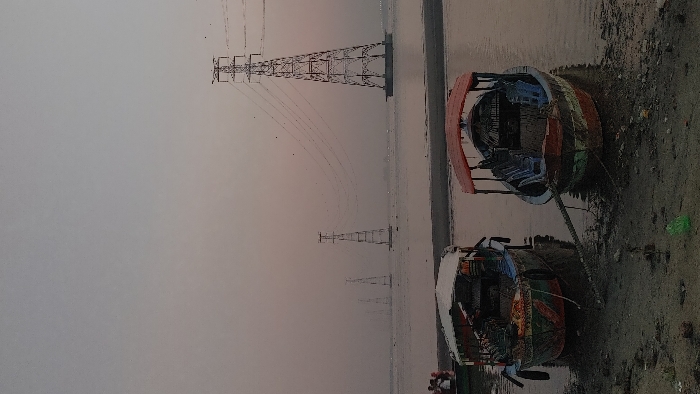 This image depicts a waterfront scene at dusk or dawn in Kumarvog, Bangladesh