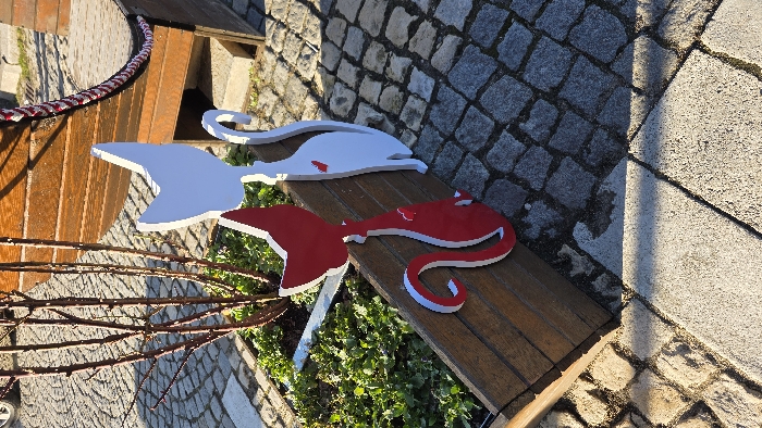 - "This image captures an outdoor scene in Tryavna, Bulgaria, featuring two decorative cat-shaped figures positioned on a cobblestone pavement next to a wooden planter box" by FM-BFixr1, licensed under CC BY 4.0