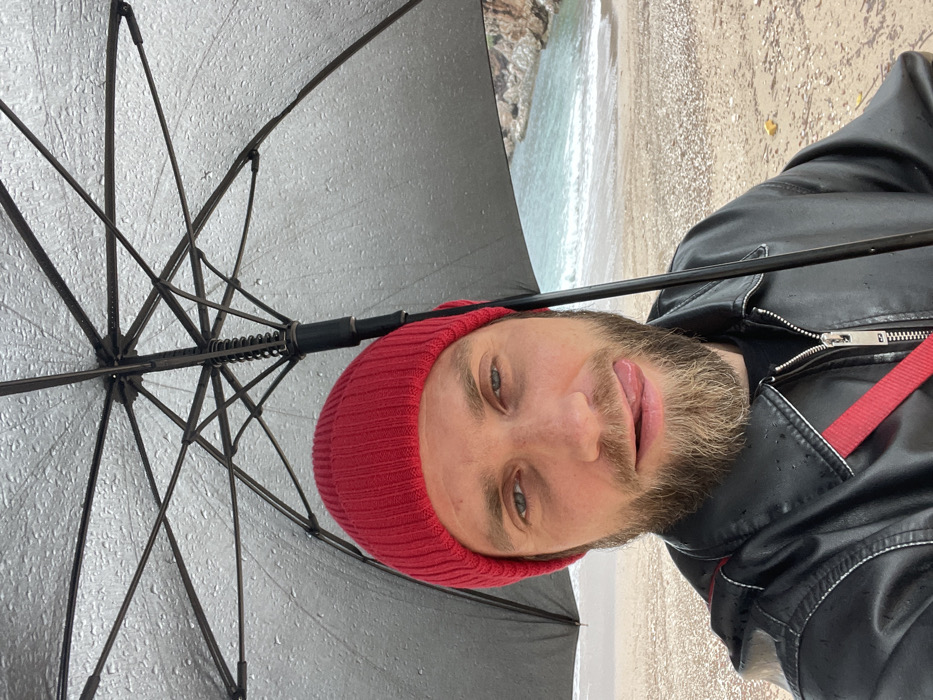 A male subject is depicted in a selfie, positioned outdoors on a beach in Pržno, Montenegro. He is holding an open black umbrella above his head, which shows visible water droplets on its surface. The man wears a red knitted beanie, a black leather jacket with a prominent silver zipper and white contrast stitching, and a red fabric strap diagonally across his chest. He has a light-brown beard and mustache, and his tongue is slightly extended from his mouth. The background features a light-colored sandy and pebbled beach meeting calm, light blue-green sea water, with a rocky coastline visible on the far right. The sky appears overcast.