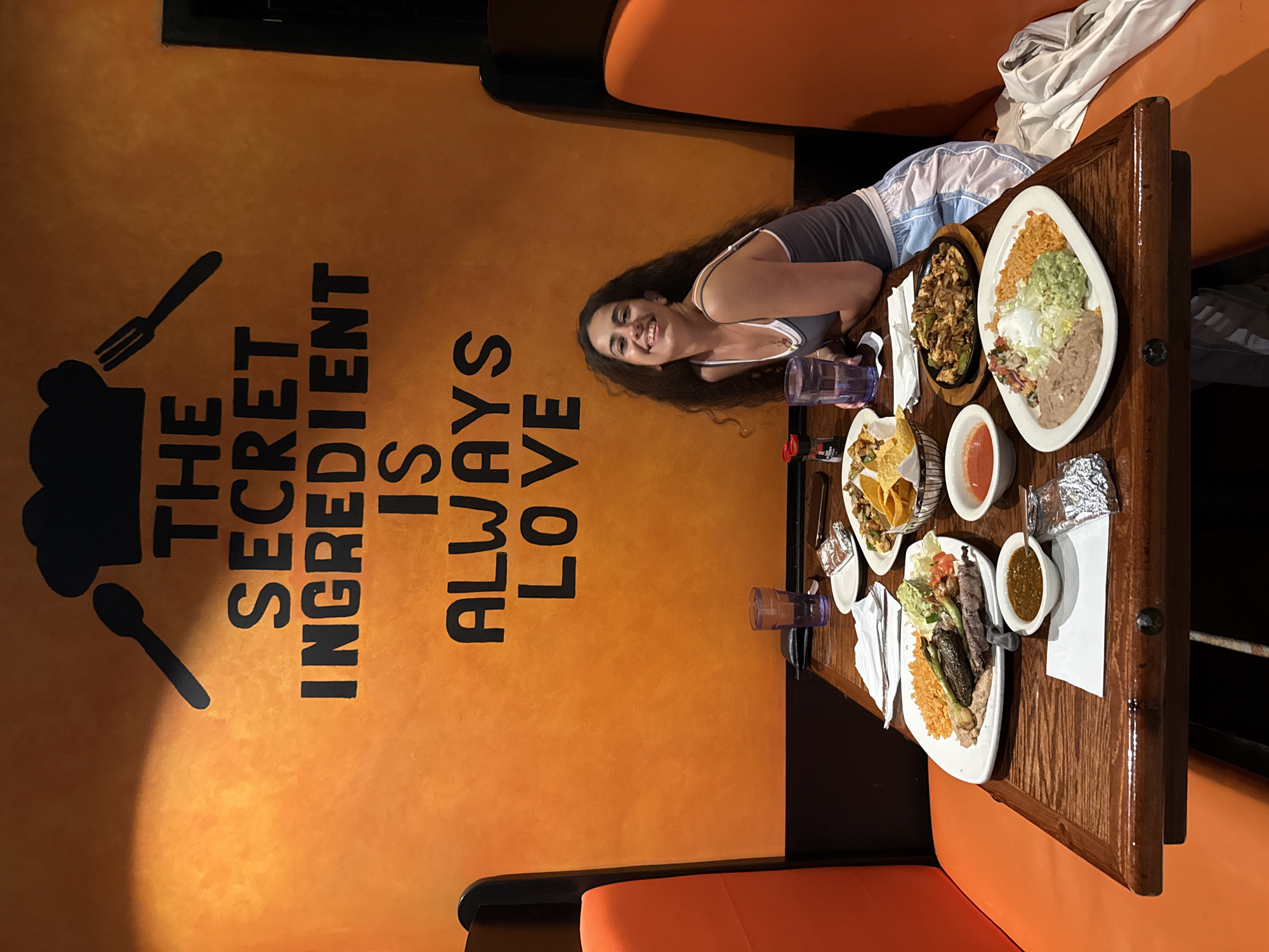 An indoor scene depicts a young adult female seated at a wooden table within a restaurant in Cave City, United States of America. The female, with long, dark, curly hair, wears a grey spaghetti-strap tank top and light blue and white patterned shorts, and is smiling directly at the viewer. Her left forearm rests on the table, near a purple-tinted glass. The dark brown wooden table is laden with multiple food items and settings. From left to right, a white rectangular plate holds refried beans, shredded lettuce, guacamole, sour cream, pico de gallo, and orange rice. A small white bowl contains red salsa. A small metallic foil packet rests on a white napkin. Further back, a larger white rectangular plate contains grilled meat, grilled green vegetables (peppers, possibly nopales), guacamole, pico de gallo, and orange rice. A wire basket holds tortilla chips. A small white bowl contains green salsa. A round, black sizzling skillet dish, containing chicken or meat strips with peppers and onions, is present. A small white plate holds a pastry or dessert item. Two spice shakers with red and black caps are also on the table. A second purple-tinted glass is visible on the far left of the table. The background wall is a vibrant, textured orange. Prominently displayed on the wall in large black letters is the phrase "THE SECRET INGREDIENT IS ALWAYS LOVE." Above this text, a black silhouette of a chef's hat is flanked by a black spoon on the left and a black fork on the right. The seating consists of orange upholstered booths with dark brown or black backrests. The area is illuminated by ambient light, with a visible light source from the left side of the frame.