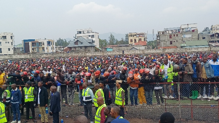 The image displays a densely populated outdoor gathering at a stadium or large public venue in Goma, Democratic Republic of the Congo