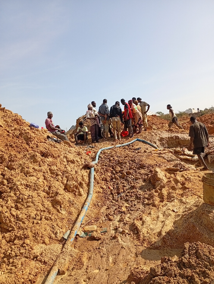 The image depicts an outdoor artisanal mining site in Katon Rikkos, Nigeria, under a clear, bright blue sky