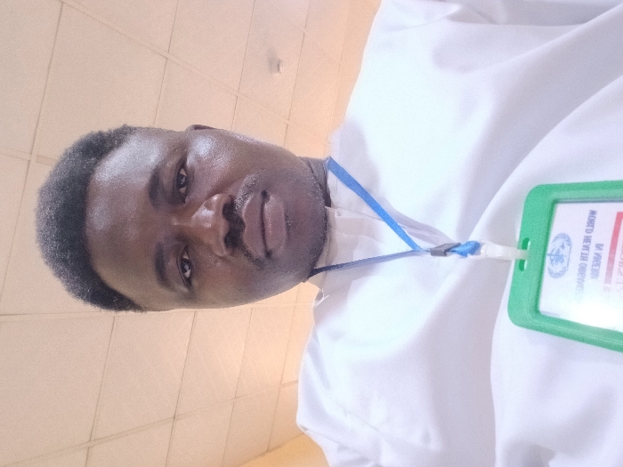 An adult male with dark skin, short dark hair, and a mustache is depicted in a close-up, head-and-shoulders portrait, looking directly at the camera. He wears a white collared garment. A blue lanyard is suspended around his neck, holding a green-framed identification badge. The badge displays the World Health Organization logo and the mirrored text "WORLD HEALTH ORGANIZATION IN NIGERIA". The background features a light-colored ceiling with square acoustic tiles, indicating an indoor institutional setting. The scene is located in Markurdi, Nigeria.