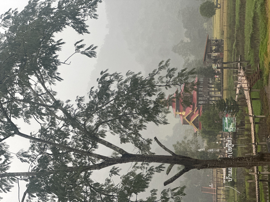 The scene depicts a misty, rural landscape within Ban Paem Bok, Thailand