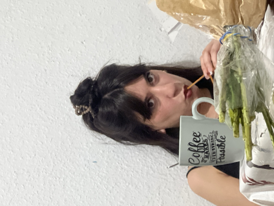 A woman with dark hair in a bun is looking at the camera with a playful expression. She has a strand in her mouth. She is holding a mug that says "Coffee Makes Everything Possible." Next to her are asparagus wrapped in clear plastic and brown paper. The background is a white wall. The image is slightly tilted.