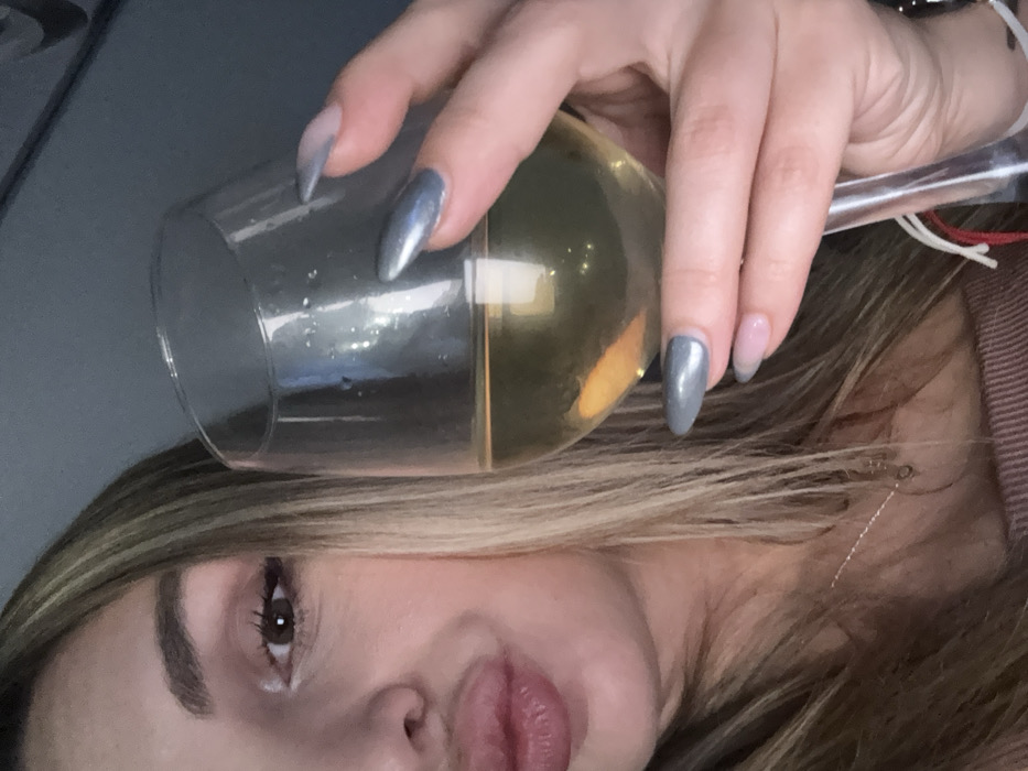 The image displays a close-up, cropped view of a single individual, characterized as female, with her face partially visible on the left side of the frame. Her right eye is open, and her lips are pursed in a deliberate pose. She has long, light-colored hair, an eyebrow, and appears to be wearing makeup. A light-colored garment is visible below her chin, along with a delicate necklace featuring a small pendant. Her right hand, featuring long, almond-shaped fingernails painted with a metallic grey/silver ombre polish, holds a clear stemmed wine glass. The glass contains a pale yellow, translucent liquid. A red string bracelet is visible on her right wrist. The background is uniformly dark grey and out of focus, providing no discernible environmental or architectural details. The specific location in the city of Plovdiv, Bulgaria, cannot be determined from the visual information presented in the image.