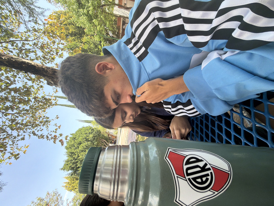An outdoor scene within the city of Puebla, Mexico, depicts three individuals seated at a blue metal mesh table under a clear blue sky with dappled sunlight filtering through overhead trees. In the foreground, a large, olive green thermos with a silver top and a dark green ribbed cap stands prominently, bearing a sticker of the Club Atlético River Plate shield logo. To the right of the thermos, a young male with short brown hair, wearing a light blue and white Adidas track jacket with black stripes, looks down, with his right hand adjusting the collar of his jacket near his chin. To his left and slightly behind him, a young female with long dark brown hair is also looking down, her hands partially visible as she appears to be engaged with an object on the table. A third person's head is partially visible on the far left. The background features lush green trees, including some with autumnal leaves, and taller, slender evergreen trees, suggesting a park, schoolyard, or common outdoor area with paved sections.