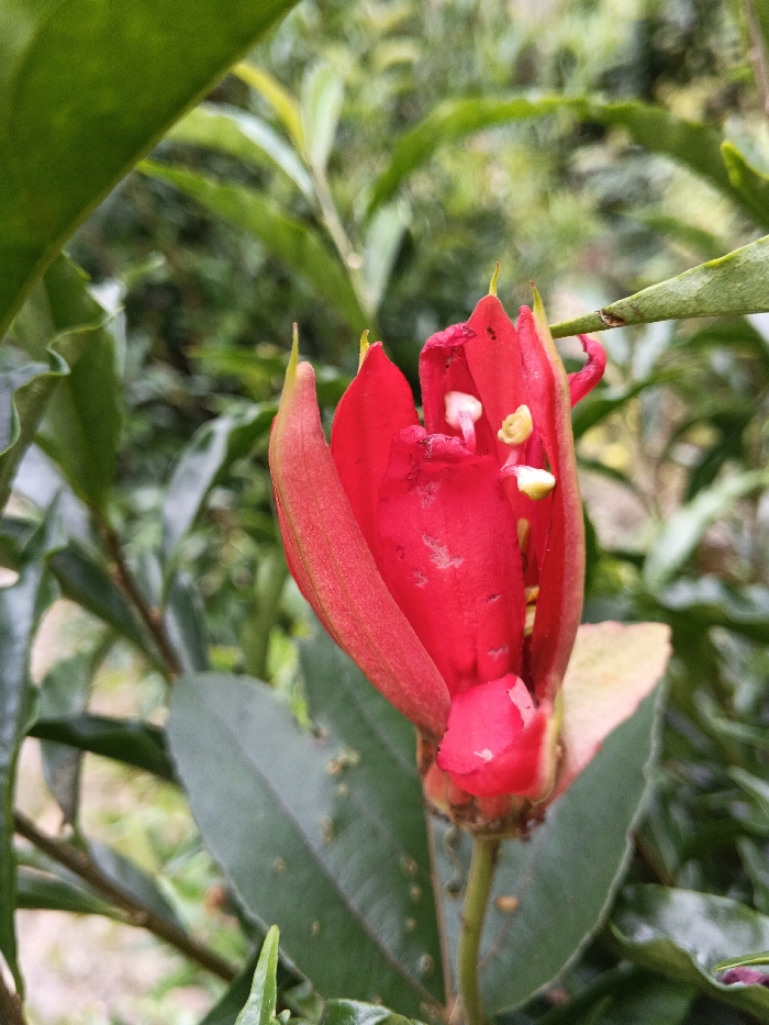 A close-up image displays a single, vibrant red flower in a partially opened state, situated amidst green foliage
