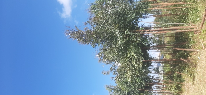 A row of thin trees lines the foreground, their leafy canopies reaching towards a vibrant blue sky dotted with wisps of white clouds. Brown, slender trunks support the trees, creating a narrow passage. Grass and low-lying vegetation cover the ground beneath. A structure, possibly a building, is visible in the distance through the trees.