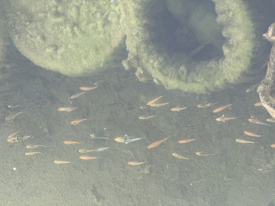 The image depicts an overhead view of a shallow, murky body of water, likely a pond or calm river section, located in Зеленогорское сельское поселение, Ukraine. Numerous fish, predominantly yellowish-orange to reddish-brown with some displaying mottled grey and black patterns, are scattered and swimming freely throughout the scene. The water exhibits a greenish-brown tint, with the bottom partially visible and covered by a layer of fine green algae or sediment. Submerged on the right side of the frame are several large, circular objects, heavily encrusted with dense green algae. These objects appear consistent with discarded tires or concrete rings, with one clearly showing a hollow center. No individuals are present in the image.