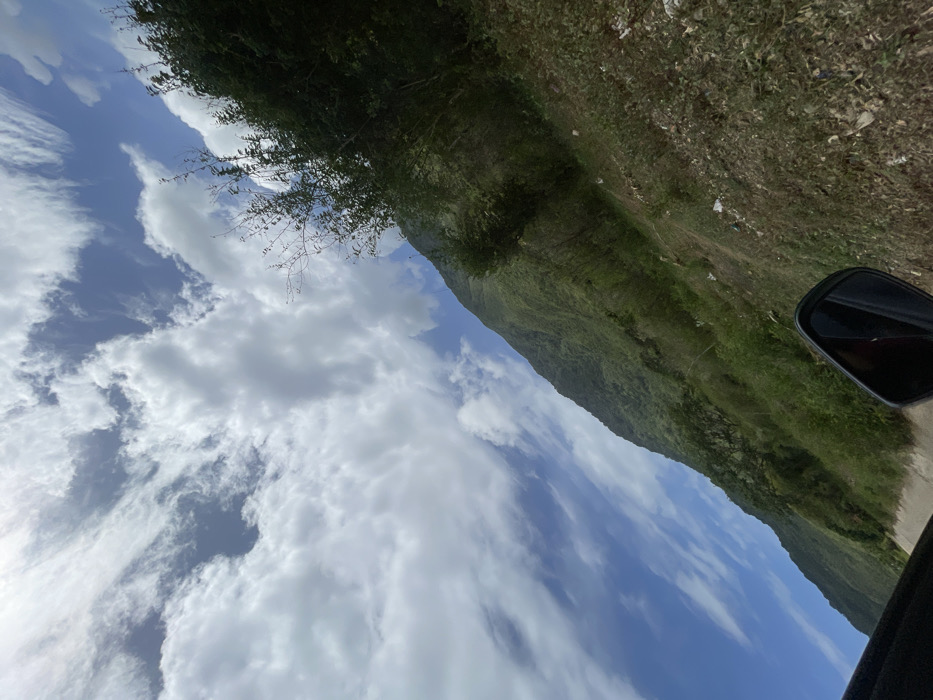 Captured from inside a car, a view reveals a lush, green hillside contrasting with a bright, cloudy sky. The car's side mirror is visible, reflecting the interior. The hillside stretches diagonally across the frame, meeting the sky filled with fluffy white clouds. Green foliage and trees line the edge of the road, while some litter is scattered on the ground. The composition suggests a scenic drive through a mountainous region.