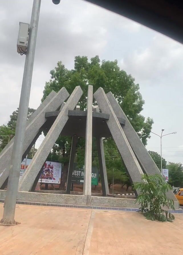 The camera is inside a vehicle, looking out at a roundabout in Enugu, Nigeria. In the center of the roundabout is a modern sculpture made of gray concrete slabs arranged in a conical shape, forming an open structure. A small water feature with blue tiles surrounds the base of the sculpture. A light pole and a surveillance camera are also present within the roundabout. Adjacent to the roundabout, billboards advertise a music and comedy event and promote investment in Enugu. A black car is seen driving on the road that curves around the roundabout. The sky is overcast, and green trees are visible in the background. The video appears to be a quick shot taken while passing through the roundabout.