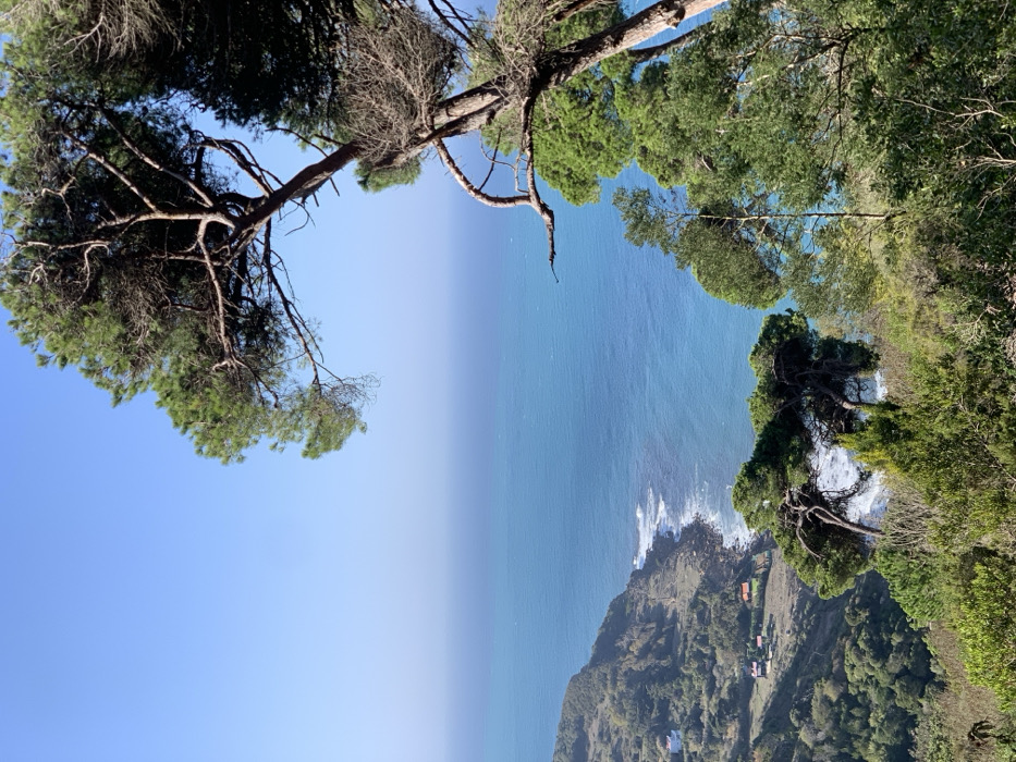 The scene captures a cliffside view from an elevated perspective, with the sky transitioning to the ocean on the left. Trees frame the image, with lush green foliage on the right. The sea crashes against the rocky shore at the base of the cliff. A small village is visible on the slope, nestled among trees.