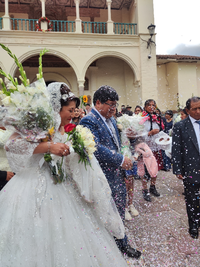 A wedding scene unfolds with a bride in an elaborate white gown and veil, holding a bouquet, alongside a groom in a blue suit, both showered in confetti. Behind them, a wedding party smiles and holds bouquets. An older man in a dark suit walks on the right. The backdrop is a white building with arches and a balcony adorned with a wreath.