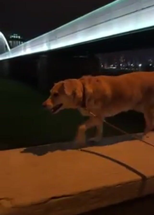 At night, a light brown dog on a leash walks along a concrete wall, with a bridge visible in the background. The bridge is illuminated with white lights. The area behind the wall appears to be grassy. The sky is dark and the scene is illuminated by artificial light sources.